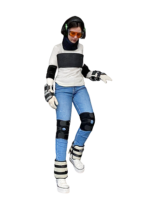 - Zweiteiliger Anzug: enthält Gewichte zur Simulation von Kraftverlust an anatomisch wichtigen Positionen